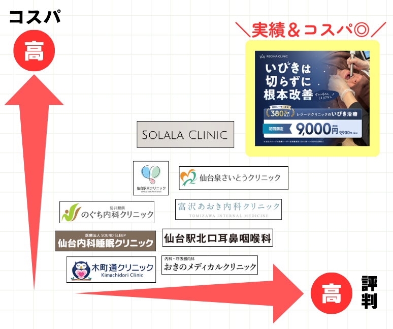 当サイトでは、上記3つのポイントを踏まえて、仙台で人気のいびき治療クリニック全10院を徹底比較しました。