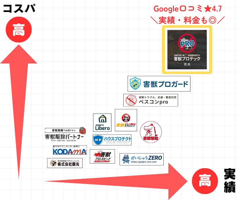 最後に、筆者が駆除業者に同じ条件で見積もりをしてみた結果が、平均相場が55,000円でしたので、それを基準に比較してみました。