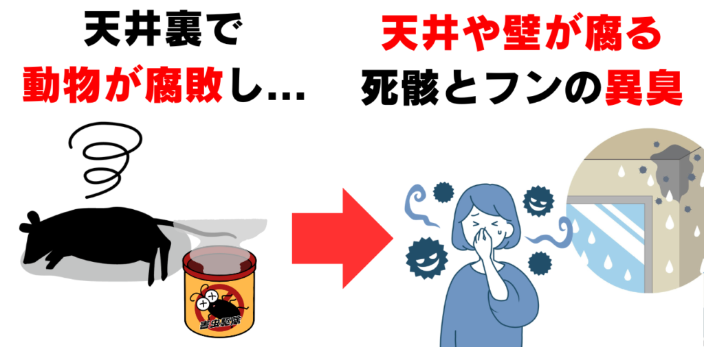 次のシーズンにはまた来るので、屋根裏が死骸とフンと生きた動物がいる状態になります。