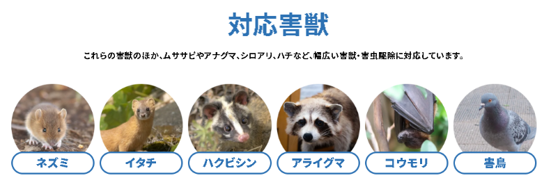 | ネズミ・イタチ・ハクビシン・アライグマ コウモリ・害鳥・ムササビ・アナグマ ヘビ・シロアリ・ハチ など | |