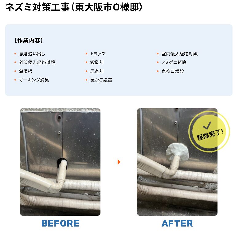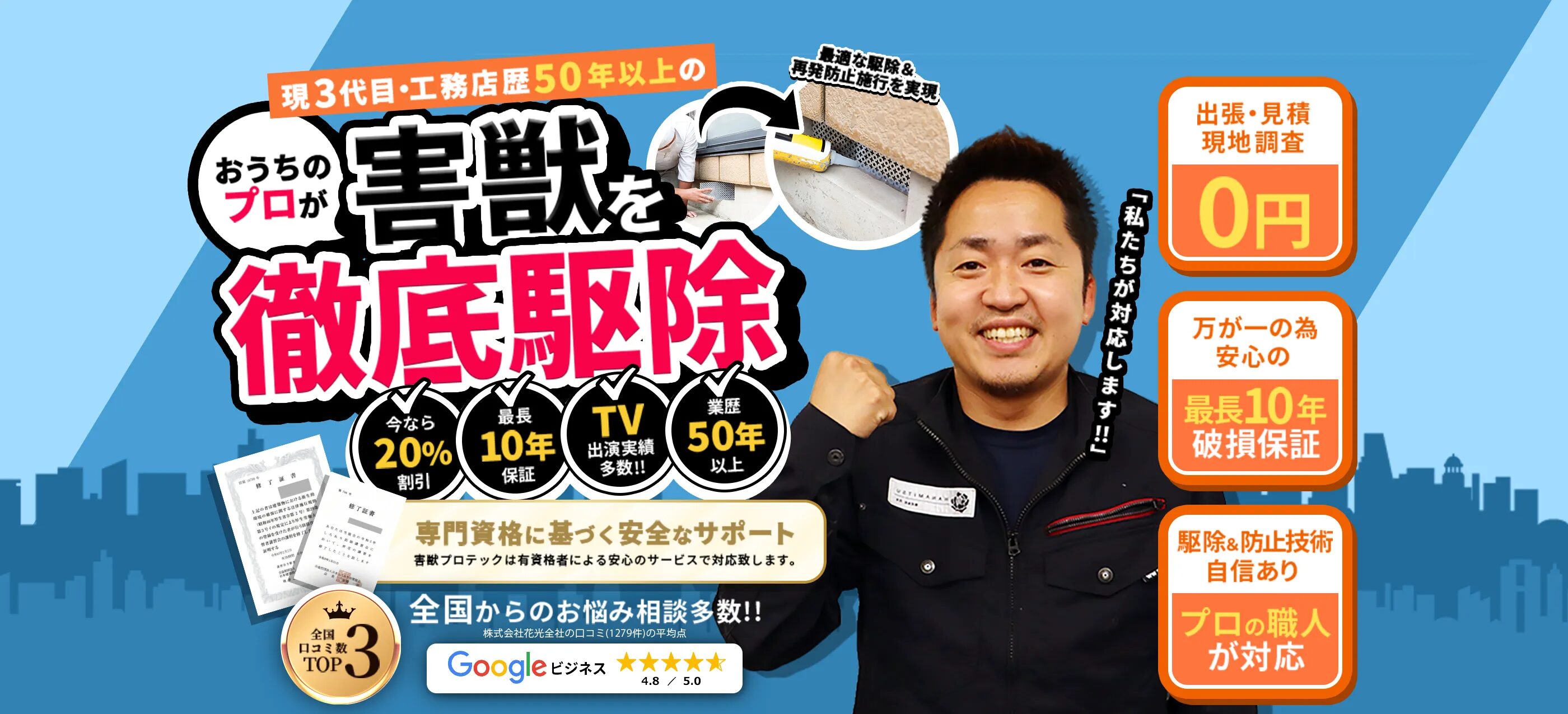 | 口コミ 評判 | Google口コミ★4.8 業歴50年以上で メディア出演多数 | 対応地域が広い 24時間365日 電話/メールで対応 | イタチ駆除に強い 関西密着型の 専門業者 |