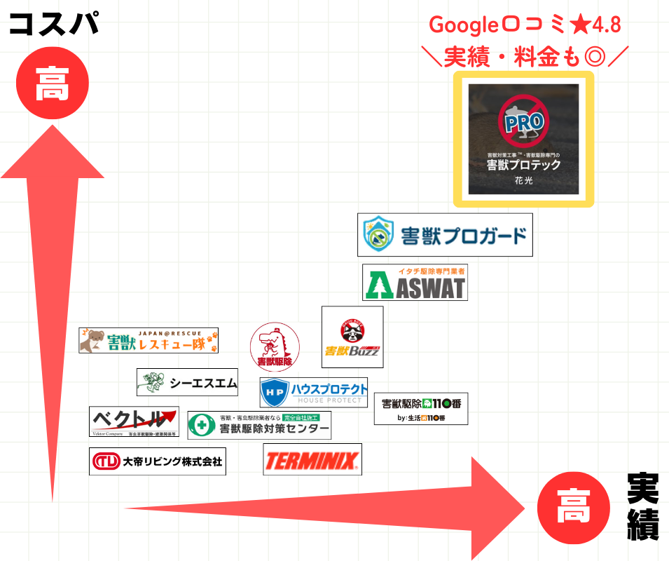 最後に、筆者が駆除業者に同じ条件で見積もりをしてみた結果が、平均相場が55,000円でしたので、それを基準に比較してみました。
