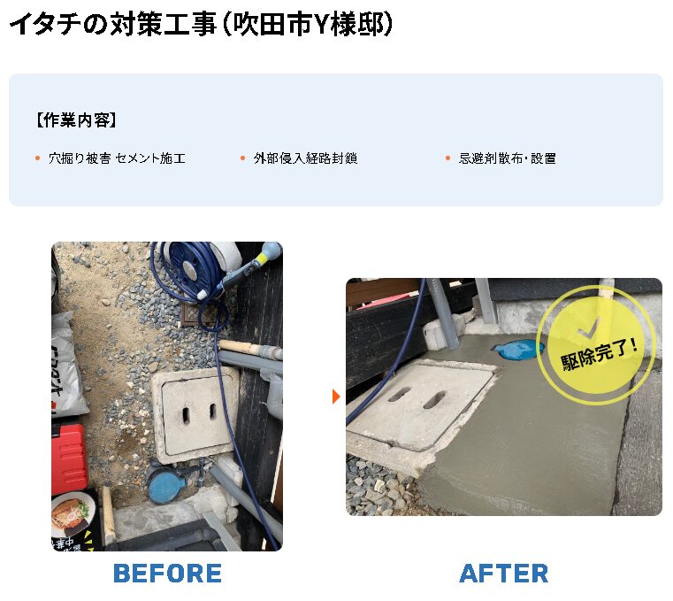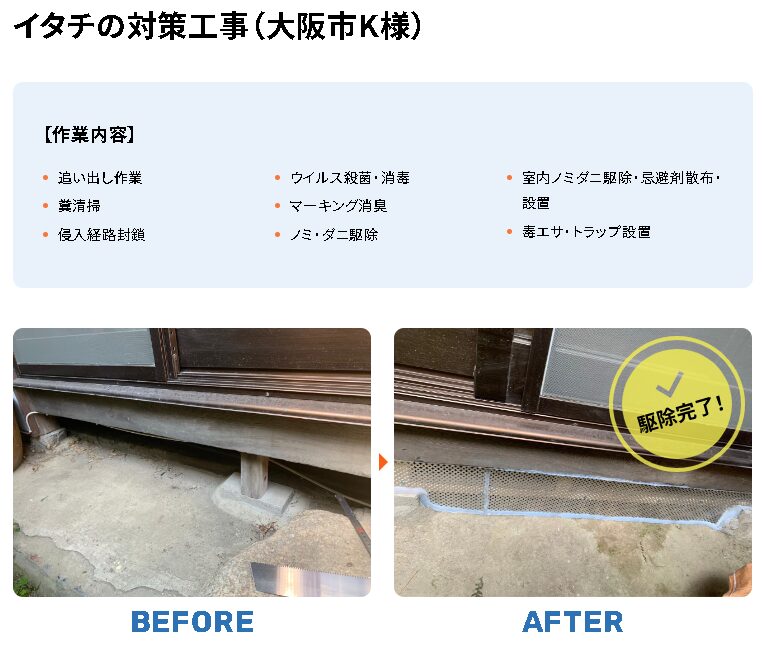 見積もり依頼も翌日に来ていただけ、駆除.予防措置等も行っていただきました。