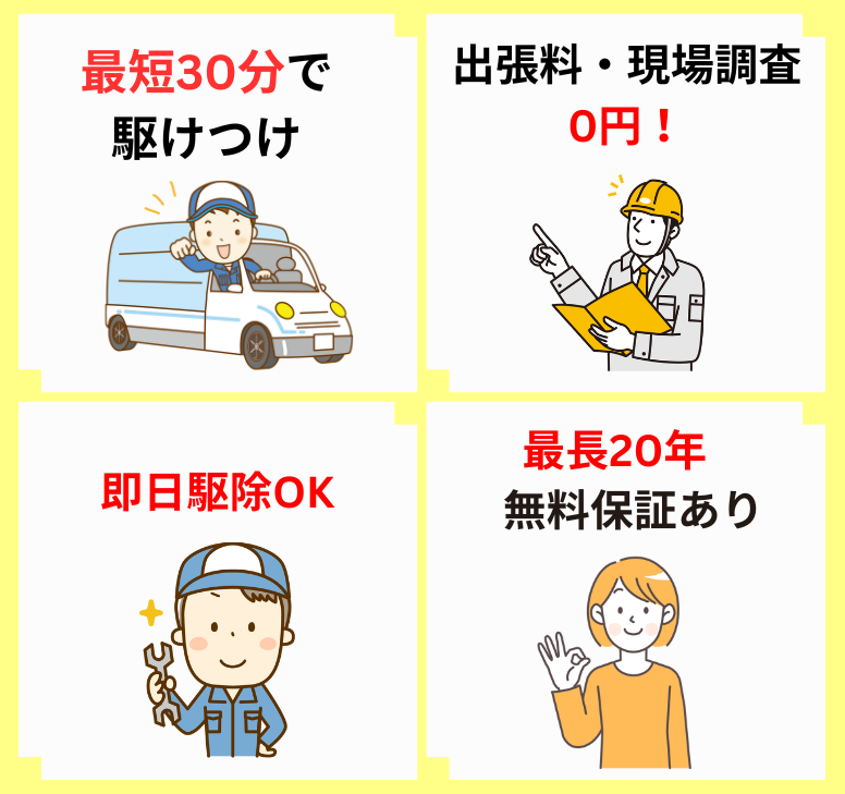 | 24時間 土日祝・深夜も対応 | 出張/現場調査/見積もり すべて0円 |